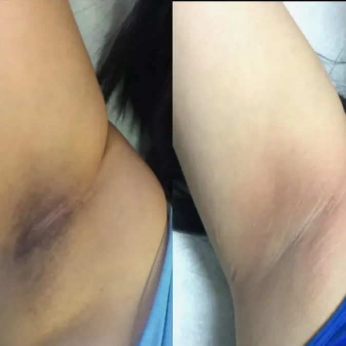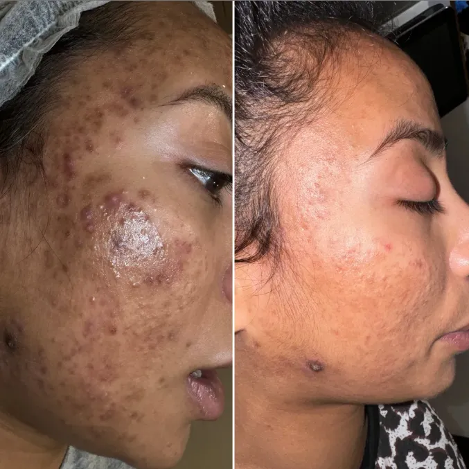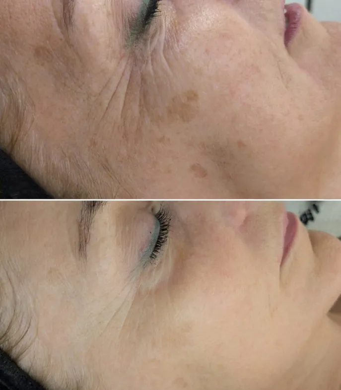 Some clients may notice a slight glow or improvement shortly after the treatment, but the more noticeable results typically appear over the following days and weeks as the skin regenerates and pigmentation gradually improves. Results continue to improve with each additional session.